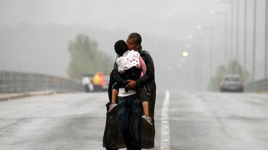 Είναι μια από τις πιο χαρακτηριστικές φωτογραφίες της προσφυγικής κρίσης: Ένας πατέρας κρατά στην αγκαλιά και φιλά το παιδί του. Περπατάει στην γέφυρα της Ειδομένης, διασχίζοντας τα σύνορα Ελλάδας - Σκοπίων, κατά την διάρκεια κορύφωσης της προσφυγικής κρίσης, τον Σεπτέμβριο του 2015. Βρέχει και φορά μόνο μια πλαστική σακούλα σκουπιδιών για να προστατευτεί. Δεν έχει πράγματα, έχει μόνο το παιδί του αγκαλιά και προχωρά...