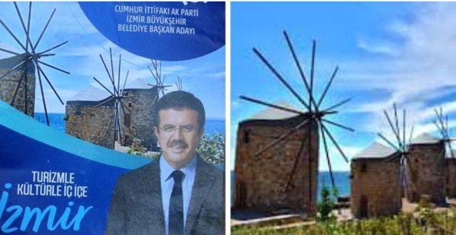 Στην πρώτη σελίδα του προεκλογικού του φυλλαδίου που κυκλοφόρησε, το γραφικό τοπίο με τους ανεμόμυλους και τη θάλασσα με το βαθυγάλαζο χρώμα δεν ήταν η Σμύρνη αλλά η… Χίος. Μέσα έπεσε ο ισλαμιστής υποψήφιος, αν κρίνει μάλιστα κανείς από το σλόγκαν του: «Σμύρνη, συνυφασμένη με τον τουρισμό και τον πολιτισμό». Μόνο που οι ανεμόμυλοι είναι στα Ταμπάκια στην Χίο..