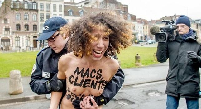 Φωνάζοντας "μαστροποί-πελάτες να κηρυχθούν ένοχοι", οι τρεις ακτιβίστριες αιφνιδίασαν τους αστυνομικούς που είχαν πάρει θέσεις μπροστά από το δικαστήριο και μία εξ αυτών σκαρφάλωσε στο καπό του αυτοκινήτου με τα σκούρα τζάμια που μετέφερε τον Ντομινίκ Στρος-Καν, ενώ οι δύο άλλες στάθηκαν γύρω από το αυτοκίνητο, πριν τεθούν όλες υπό κράτηση.