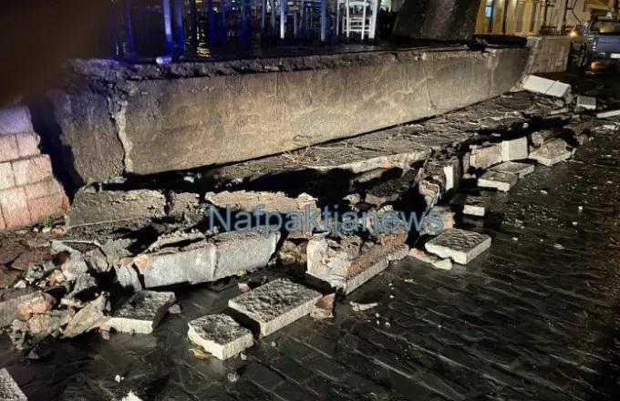 Σύμφωνα με το nafpaktianews.gr, οι σοβαρότερες ζημιές από την κακοκαιρία προκλήθηκαν στην πλατεία του λιμανιού της Ναυπάκτου, καθώς αποκολλήθηκε τμήμα του νότιου τοιχίου, πιθανότατα επειδή μετατοπίστηκε το βάρος στη βάση του μεγάλου πλατάνου από τους ισχυρούς ανέμους.