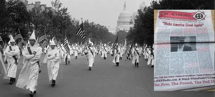 Εντρομο το επιτελείο του Τραμπ έσπευσε να αποκηρύξει δημοσίως την υποστήριξη της Κου Κλουξ Κλαν. «Ο κ. Τραμπ καταγγέλλει το μίσος σε οποιαδήποτε μορφή του. Το εν λόγω δημοσίευμα είναι αποκρουστικό και οι απόψεις του δεν αντιπροσωπεύουν τα δεκάδες εκατομμύρια των Αμερικανών που συμπαρατάσσονται μαζί μας» δήλωσε εκπρόσωπος του Τραμπ.