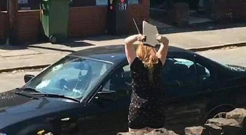 Στο βίντεο που τράβηξε ένας 21χρονος αυτόπτης μάρτυρας σε συνοικία του Κάρντιφ, η εξοργισμένη κοκκινομάλλα φαίνεται να σηκώνει μια μεγάλη πέτρα και με τα δύο χέρια και να τη ρίχνει στο παράθυρο του οδηγού, κάνοντάς το θρύψαλα.