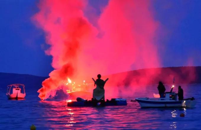 Το ομοίωμα του Ιούδα είχε τοποθετηθεί σε ειδική εξέδρα μέσα στην θάλασσα και βάρκες με βεγγαλικά ξεκίνησαν από το λιμάνι του Τολού και πυρπόλησαν τον στόχο τους.
