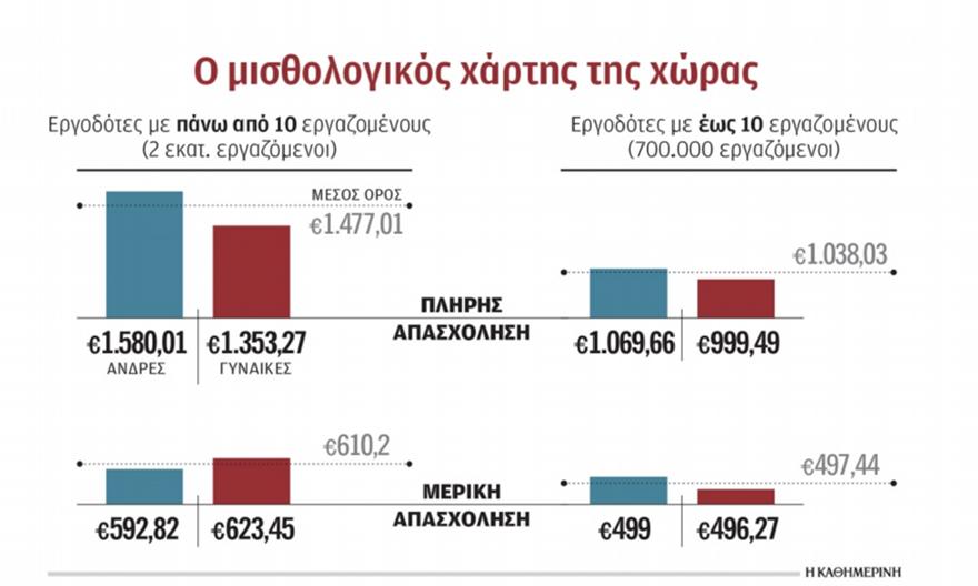 3. Η διαφορά στον μισθό με βάση το φύλο παραμένει επίσης σημαντική. Φτάνει περίπου στο 20% για το σύνολο της χώρας, καθώς ο μέσος μισθός των ανδρών φτάνει στα 1.289 ευρώ και των γυναικών στα 1.078 ευρώ. Στις μεγάλες επιχειρήσεις οι άνδρες αμείβονται με 1.418 ευρώ κατά μέσον όρο και οι γυναίκες με 1.181 ευρώ, ενώ στις μικρές η ψαλίδα είναι μικρότερη: 890 ευρώ για τους άνδρες και 784 ευρώ για τις γυναίκες, οι οποίες διαπιστώνεται ότι καταλαμβάνουν μεγαλύτερο μερίδιο στη μερική απασχόληση.