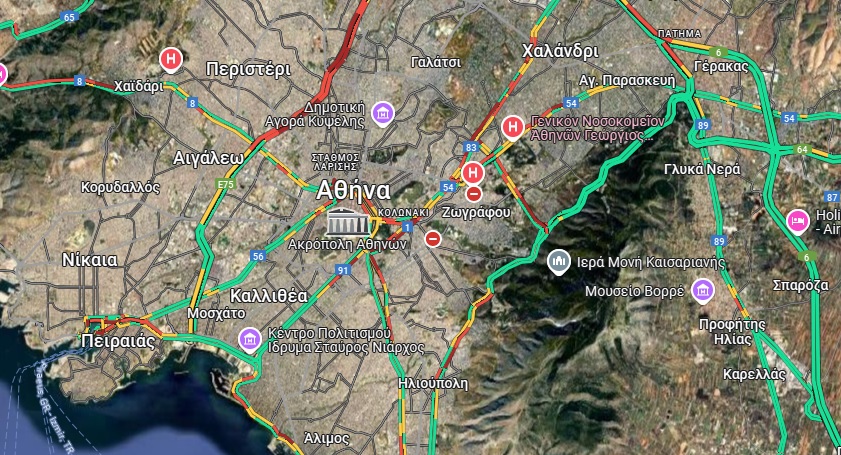 Μεγάλες καθυστερήσεις σημειώνονται επίσης στο ανοδικό ρεύμα της λεωφόρου Κηφισού, στη λεωφόρο Φυλής τόσο στο ύψος του Καματερού, όσο και πλησιάζοντας την πλατεία των Αγίων Αναργύρων, στον άξονα Καρόλου-Μάρνη, στις ανόδους Β. Κωνσταντίνου και Β. Σοφίας προς το σημείο συνάντησής τους και στην Αττική Οδό προς το αεροδρόμιο στο ύψος του κόμβου Μεταμόρφωσης, στις Κατεχάκη και Κανελλοπούλου προς τα στρατιωτικά νοσοκομεία και τέλος στον Σκαραμαγκά.