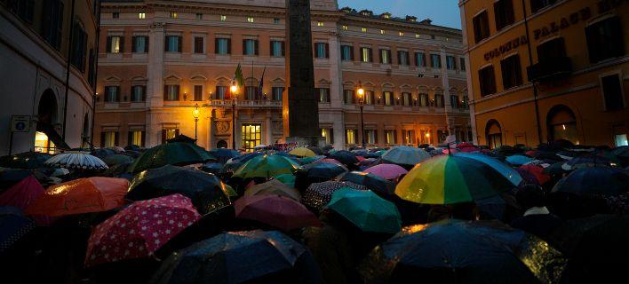 Στην Ανκόνα πολύχρωμες ομπρέλες και πανό γέμισαν την κεντρική πλατεία.