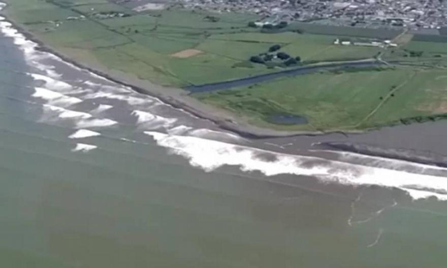 Small tsunami waves seen surging up river at Kujukuri Beach in the Chiba Prefecture of Eastern Japan.