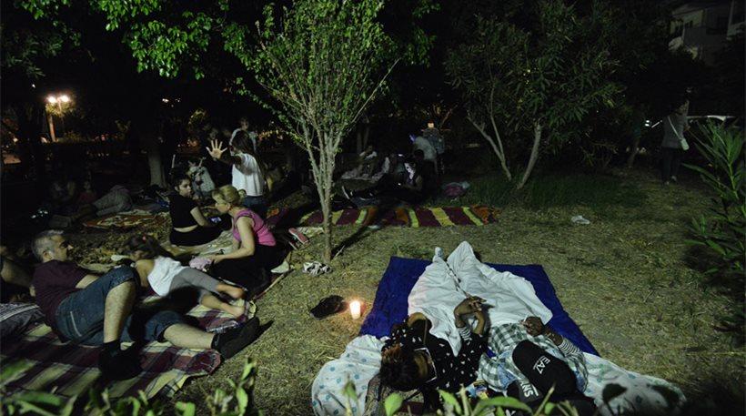 Λίγο έξω από το κέντρο, σε μικρές πλατείες οι κάτοικοι έστησαν σκηνές, πήραν κουβέρτες και σεντόνια, κάποιοι έβαλαν ακόμη και στρώματα θαλάσσης και κοιμήθηκαν με συντροφιά τα αστέρια και το φεγγάρι, φοβούμενοι πως ο Εγκέλαδος θα χτυπήσει ξανά.