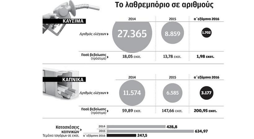Αντίθετα, οι έλεγχοι στα καπνικά, αν και λιγότεροι, δείχνουν ότι το λαθρεμπόριο τσιγάρων εξαιτίας της αύξησης της φορολογίας έχει ξεπεράσει κάθε προηγούμενο. Σύμφωνα με τα στοιχεία της Γενικής Γραμματείας Δημοσίων Εσόδων από τους ελέγχους κατά το πρώτο εξάμηνο βεβαιώθηκαν δασμοί και φόροι ύψους 200,9 εκατ. ευρώ, όταν το 2014 το συνολικό ποσό που είχε βεβαιωθεί δεν ξεπερνούσε τα 60 εκατ. ευρώ.