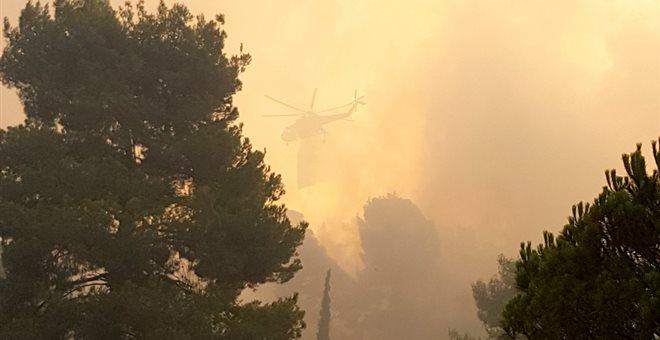 Επί τόπου βρίσκονται ισχυρές επίγειες δυνάμεις ενώ ρίψεις νερού πραγματοποιούν δύο ελικόπτερα Σινούκ και δύο Καναντέρ.