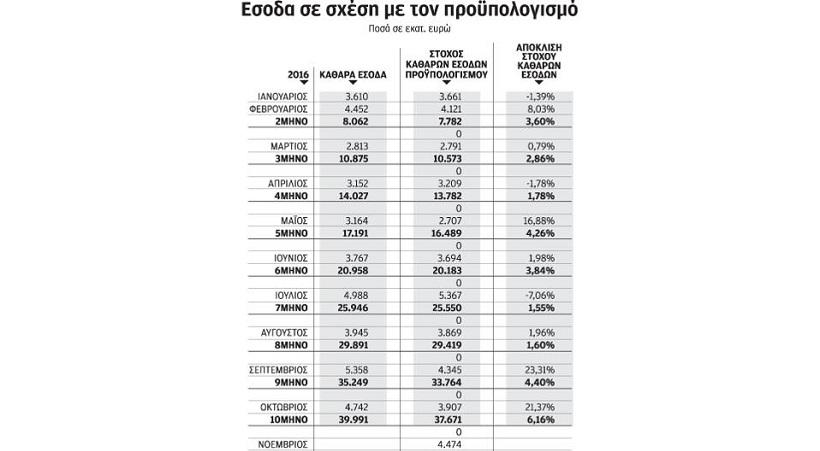 Στο 10μηνο Ιανουαρίου-Οκτωβρίου τα στοιχεία δείχνουν ότι τα καθαρά έσοδα υπερέβησαν τον στόχο κατά 2,32 δισ. ευρώ, καθώς εισπράχθηκαν 39,991 δισ. ευρώ, έναντι στόχου 37,671 δισ. ευρώ. Η υπέρβαση είναι της τάξεως του 21,37%.