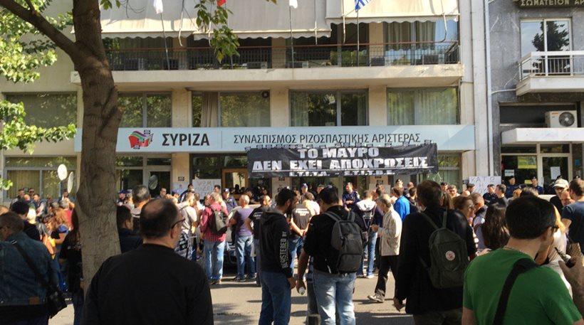 Τα μέλη της Ένωσης Τεχνικών Ιδιωτικής Τηλεόρασης Αττικής άνοιξαν ένα μαύρο πανό στην είσοδο των γραφείων του ΣΥΡΙΖΑ.