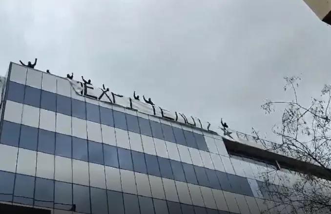 Μέλη του Ρουβίκωνα ανέβηκαν χωρίς να τους αντιληφθεί κανείς στην ταράτσα του κτιρίου της Hellenic Train και ανήρτησαν πανό που γράφει «μέχρι τέλους».