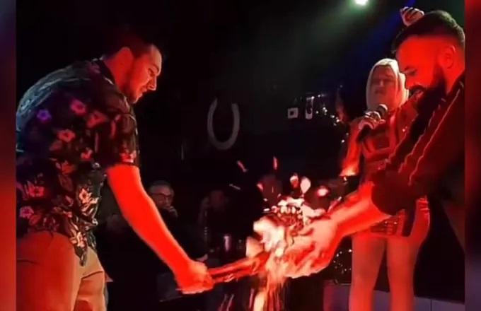 Ένας θαμώνας πάνω στο τσακίρ κέφι - και ενώ η αοιδός τραγουδούσε το «Παράλληλη αγάπη» - μεράκλωσε τόσο πολύ που πήρε έναν… κάβουρα και άρχισε να σπάει στοίβες πιάτων πάνω στην πίστα, κρατώντας μάλιστα και τον ρυθμό.
