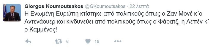«Η Ενωμένη Ευρώπη κτίστηκε από πολιτικούς όπως ο Ζαν Μονέ κ/ο Αντενάουερ και κινδυνεύει από πολιτικούς όπως ο Φάρατζ, η Λεπέν και ο Καμμένος!», έγραψε ο εκπρόσωπος Τύπου της Νέας Δημοκρατίας.