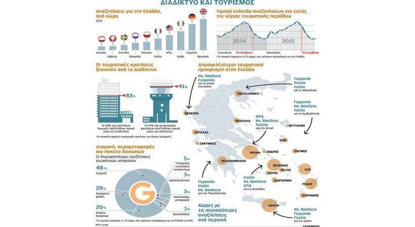 Τι ψάχνουν πριν ή αφού έρθουν στην Ελλάδα; «Είναι σημαντικό οι επαγγελματίες του τουρισμού να γνωρίζουν ποιοι είναι οι δυνητικοί τους πελάτες και να διαμορφώνουν ανάλογα τη στρατηγική τους», σχολιάζει στην «Κ» η Μαρία Φουντά, διευθύντρια Μάρκετινγκ της Google. «Πληροφορίες μέσα από τα δωρεάν εργαλεία που προσφέρει η πλατφόρμα της Google, όπως τα google trends και το Consumer barometer, σχετικά με το τι ψάχνουν οι επισκέπτες σε κάθε περιοχή μπορούν να χρησιμοποιηθούν για την ενίσχυση της ανταγωνιστικότητας των προϊόντων και των υπηρεσιών τους». Για την Ελλάδα ενδιαφέρονται αρκετά οι Βρετανοί, ενώ ακολουθούν οι Γερμανοί, οι Ιταλοί, οι Αμερικανοί κ.ά. Δημοφιλέστερες αναζητήσεις είναι η διαμονή, οι αερομεταφορές και τα συνολικά πακέτα διακοπών.