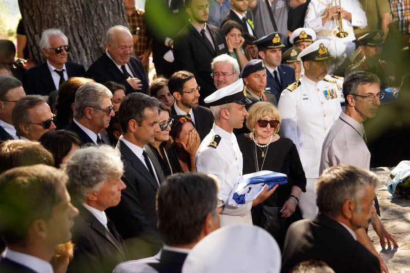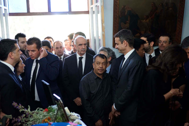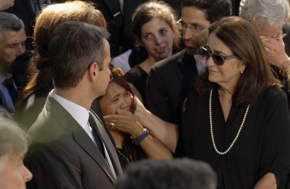 Στην πρώτη σειρά, δίπλα στα παιδιά και τα εγγόνια, μαζί με τα παιδιά και τα εγγόνια, παρηγορώντας πότε εκείνοι τα παιδιά του Κωνσταντίνου Μητσοτάκη και πότε το αντίστροφο αποχαιρέτησαν με δάκρυα στα μάτια και αδυνατώντας να κρύψουν τον πόνο τους τον άνθρωπο με τον οποίο ζούσαν τα τελευταία χρόνια.