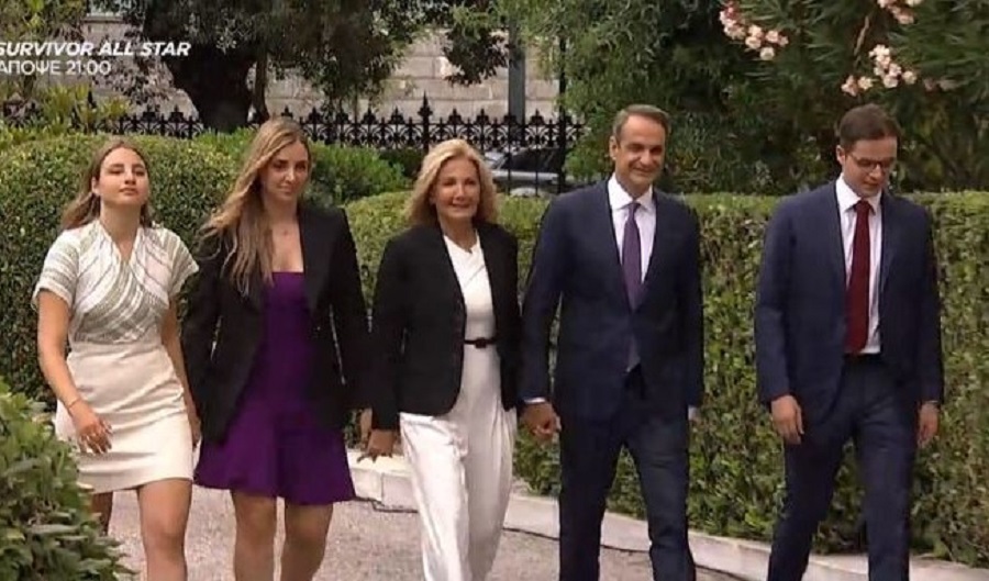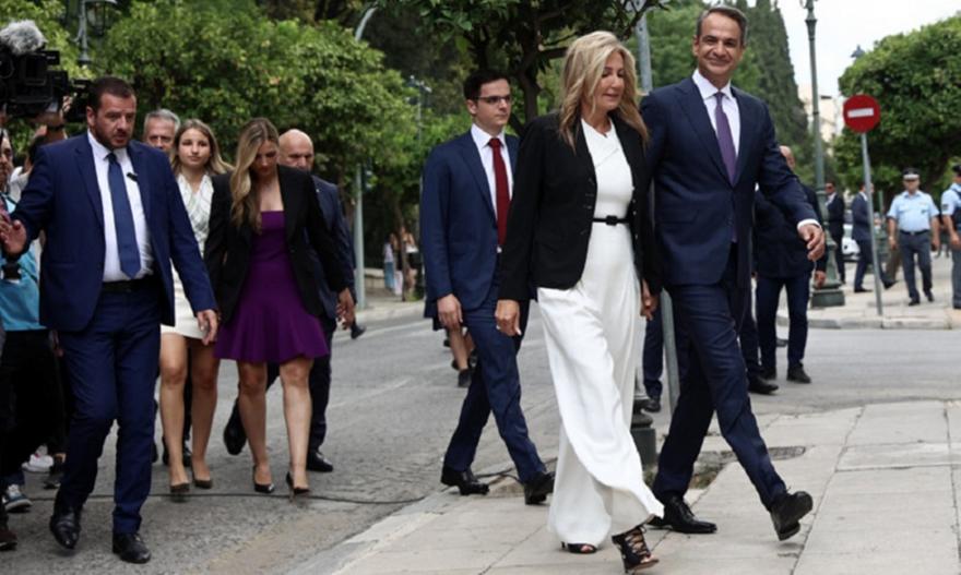 Ο κ. Μητσοτάκης έφτασε στο Προεδρικό Μέγαρο κρατώντας από το χέρι την σύζυγό του, Μαρέβα, ακολουθούσε ο γιος τους Κωνσταντίνος, ενώ χέρι-χέρι περπατούσαν οι δύο κόρες τους, Σοφία και Δάφνη.
