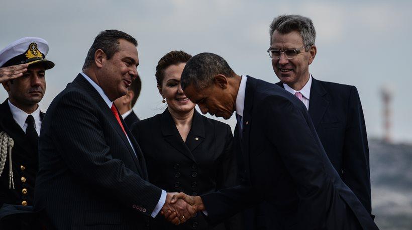 Κάτι τέτοιο φαίνεται ότι συνέβη και όταν ο φωτογραφικός φακός απαθανάτισε τον Μπαράκ Ομπάμα να κλίνει το κεφάλι του προς τον Πάνο Καμμένο λίγα λεπτά μετά την άφιξή του στο αεροδρόμιο «Ελ. Βενιζέλος».
