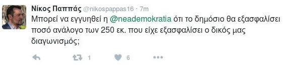 «Μπορεί να εγγυηθεί η @neademokratia ότι το δημόσιο θα εξασφαλίσει ποσό ανάλογο των 250 εκ. που είχε εξασφαλίσει ο δικός μας διαγωνισμός;» διερωτήθηκε.