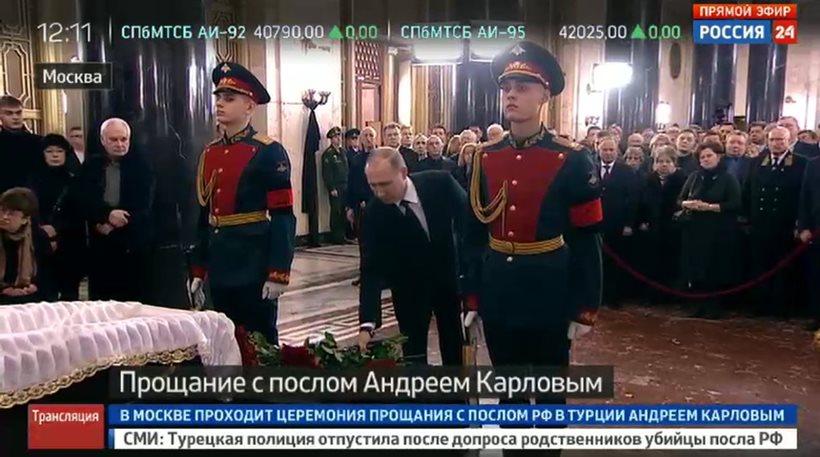 Παρουσία του προέδρου της Ρωσικής Ομοσπονδίας Βλαντιμίρ Πούτιν τελείται αυτή την ώρα στη Μόσχα η κηδεία του δολοφονηθέντος πρεσβευτή της Ρωσίας στην Άγκυρα Αντρέι Καρλόφ. Ο Βλαντιμίρ Πούτιν άφησε λουλούδια στο φέρετρο, κάθισε δίπλα στη χήρα του πρεσβευτή με την οποία είχε μία σύντομη συνομιλία και λίγα λεπτά μετά αποχώρησε.