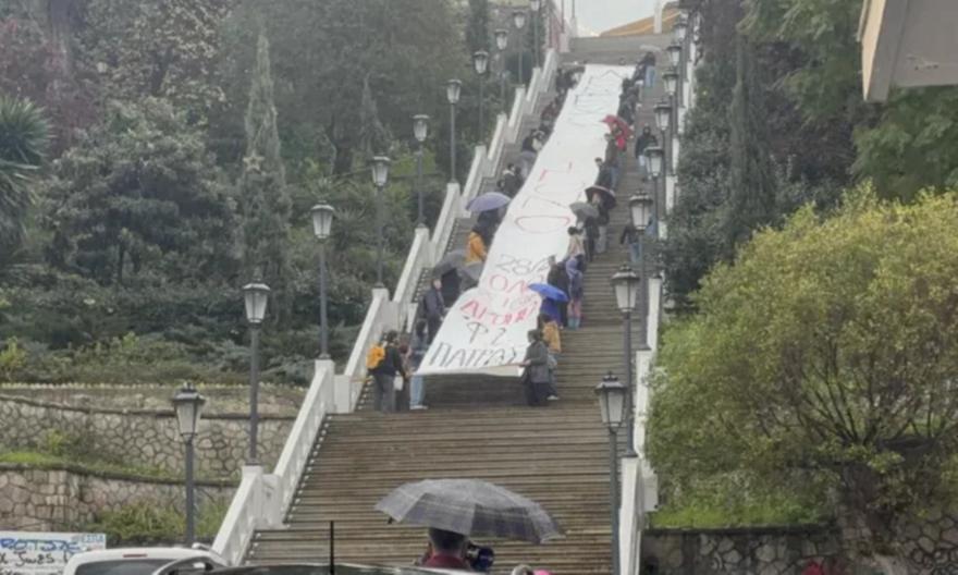 Τεράστιο πανό που κάλυπτε το μεγαλύτερο μέρος της επιφάνειας των Σκαλιών της Οδού Αγίου Νικολάου στην Πάτρα «άπλωσαν» διαδηλωτές του φοιτητικού συλλόγου ζητώντας με αυτόν τον ειρηνικό τρόπο την απόδοση δικαιοσύνης για το τραγικό δυστύχημα των Τεμπών που κόστισε τη ζωή σε 57 ανθρώπους.