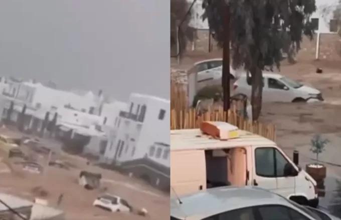 Στο «μάτι» του κυκλώνα βρέθηκε η Νάουσα της Πάρου όπου οι δρόμοι μετατράπηκαν σε ποτάμια παρασύροντας τα αυτοκίνητα.