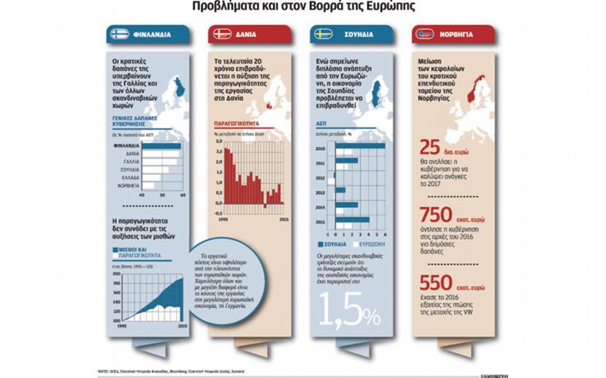Υπήρξαν σύμβολα ευημερίας καθώς εξασφάλισαν υψηλό βιοτικό επίπεδο στην πλειονότητα των πολιτών τους, φημισμένες για το γενναιόδωρο κοινωνικό τους κράτος, πρωτοπόρες στην ανάδειξη των γυναικών σε θέσεις εξουσίας και ανοικτές ως οικονομίες στη μετανάστευση. Επί μακρόν ασφαλείς από κάθε άποψη οι σκανδιναβικές οικονομίες παρέμειναν οχυρωμένες έναντι των κρίσεων της Ευρωζώνης, από την οποία κρατήθηκαν διακριτικά σε απόσταση με μοναδική την εξαίρεση της Φινλανδίας. Σήμερα, ωστόσο, δείχνουν να συμπαρασύρονται κι αυτές από τη γενικότερη επιβράδυνση της παγκόσμιας οικονομίας ή ορισμένες επιμέρους παραμέτρους της όπως η καταβαράθρωση των τιμών του πετρελαίου, η κρίση των έντυπων εκδόσεων, η υποβάθμιση της ανταγωνιστικότητας χωρών της Ευρωζώνης ή ακόμη και τα συνεπακόλουθα των οικονομικών κυρώσεων που επέβαλε η Δύση στη Ρωσία. Μετά τη Φινλανδία, τη μοναδική σκανδιναβική χώρα που είναι μέλος της Ευρωζώνης αλλά επίσης και τη μοναδική που έχει χάσει το τιμητικό τριπλό Α ως βαθμολογία πιστοληπτικής αξιολόγησης και μετά τη Νορβηγία που βλέπει να μειώνονται τα έσοδα από το πετρέλαιο, έρχεται η σειρά της Σουηδίας, της αδιαμφισβήτητης νικήτριας της παγκοσμιοποίησης που γνωρίζει την επιβράδυνση και την υποχώρηση του νομίσματός της, της σουηδικής κορώνας. Και όλα δείχνουν ότι ακολουθεί η Δανία.