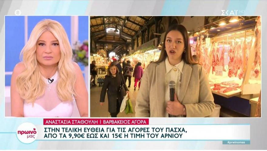 Από την Βαρβάκειο αγορά η ρεπόρτερ Αναστασία Σταθούλη μετέδωσε ότι οι τιμές για το αρνί και το κατσίκι ξεκινούν από τα 9,90 ευρώ και φτάνουν μέχρι τα 15 ευρώ. Για παϊδάκια η τιμή φτάνει μέχρι και τα 17 ευρώ/κιλό.