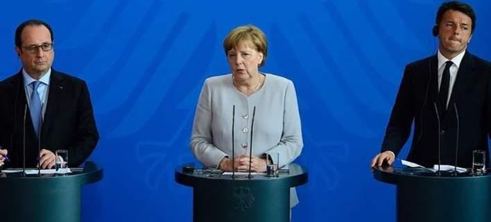 Στις πρώτες συνομιλίες τους μετά το δημοψήφισμα στα τέλη Ιουνίου, ο Ολάντ, η Μέρκελ και ο Ρέντσι- οι ηγέτες των τριών μεγαλύτερων οικονομιών της ευρωζώνης – καλούν για «νέα ώθηση» για την ΕΕ.