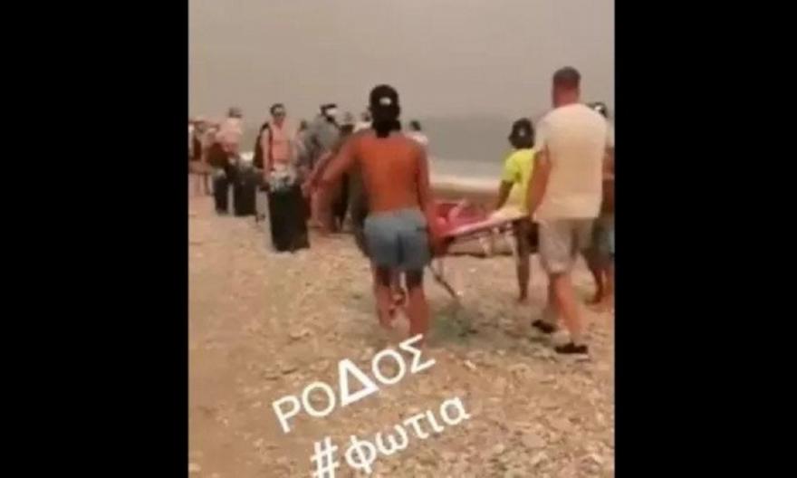 Συγκεκριμένα, τουρίστες μεταφέρουν πάνω σε ξαπλώστρα μια ημιλιπόθυμη γυναίκα σε παραλία της Ρόδου καθώς οι πυκνοί καπνοί σε συνδυασμό με τις υψηλές θερμοκρασίες κάνουν την κατάσταση δύσκολη.