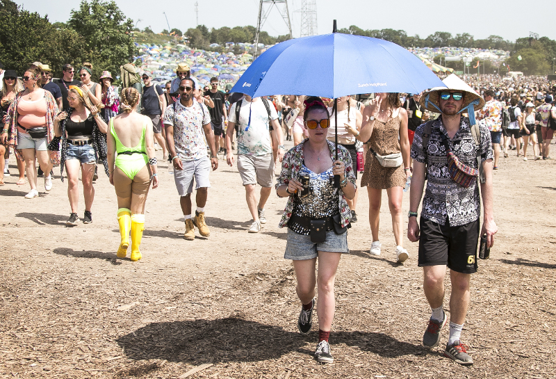 Με ομπρέλες για προστασία από τον ήλιο και στο φεστιβάλ του Γκλαστονμπέρι, στη Βρετανία