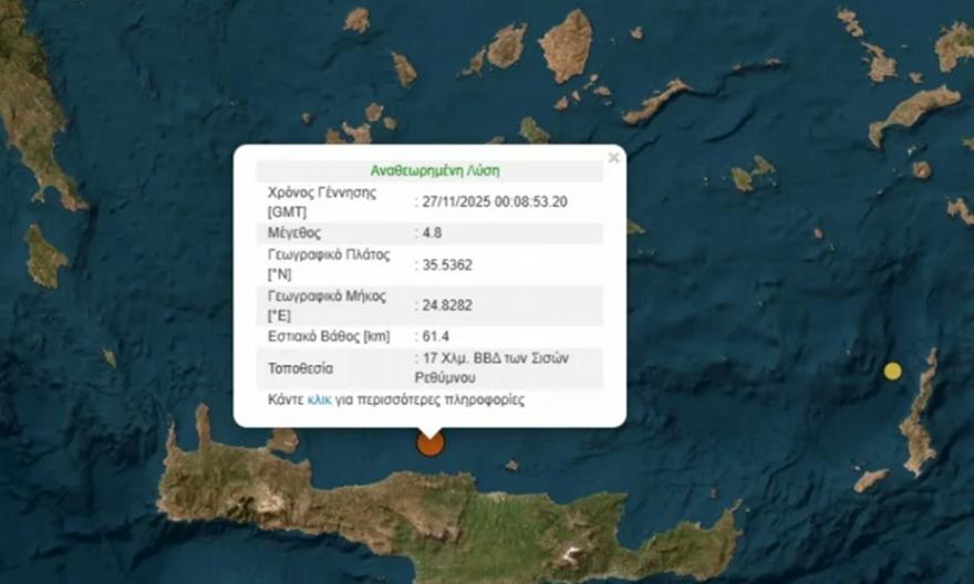 Το επίκεντρο της σεισμικής δόνησης, που χαρακτηρίζεται «ασθενής», εντοπίστηκε 17 χιλιόμετρα βόρεια-βορειοδυτικά των Σισών Ρεθύμνου και το εστιακό βάθος ήταν 34 χιλιόμετρα, σύμφωνα με το Γεωδυναμικό Ινστιτούτο της Αθήνας.
