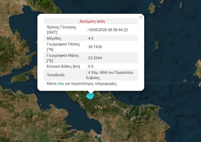 4??5?? ?? Σεισμός M 4.5, 18/05 09:56, βάθος 5 χλμ, 8 χλμ ΝΑ από Μαντούδι.