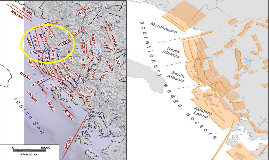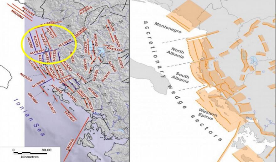 σ.σ. Λεζάντα συνημμένου χάρτη: Αριστερά τα ενεργά ρήγματα Αλβανίας και Δυτικής Ελλάδος, ως σεισμογενετικές πηγές, ως γραμμικά στοιχεία και δεξιά ως "επίπεδα" (ζώνες). Το Ανάστροφο Ρήγμα Δυρραχίου (Dures) με κωδικό ALCS301 και το αντιθετικό του ALCS 325, όπως προκύπτει από τα πρώτα σεισμολογικά δεδομένα ενεργοποιήθηκαν στον πρόσφατο σεισμό, καθώς επίσης και άλλα μικρότερα ρήγματα της ίδιας γεωτεκτονικής δομής.