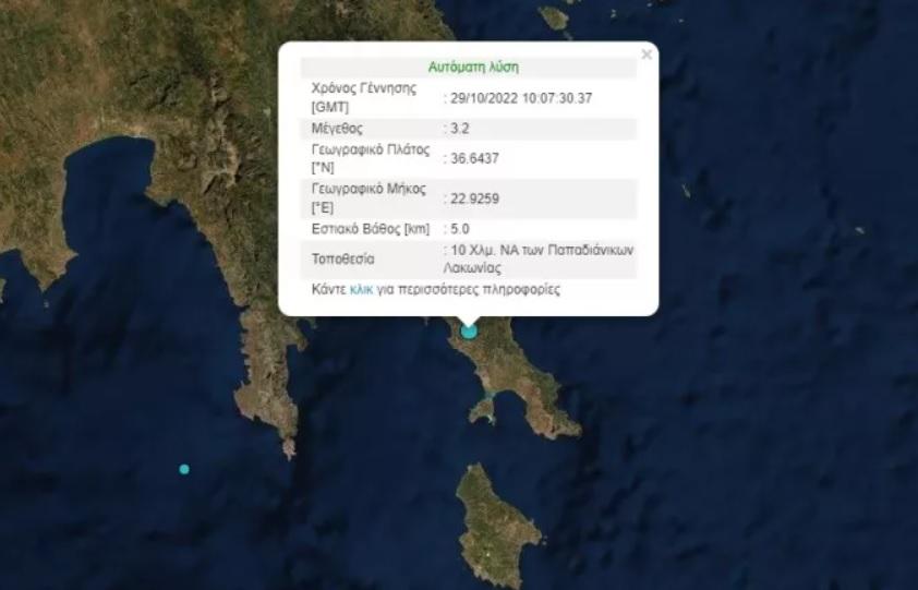 Σεισμός μεγέθους 3,2 βαθμών της κλίμακας Ρίχτερ σημειώθηκε το μεσημέρι του Σαββάτου με επίκεντρο τα Παπαδιάνικα Λακωνίας.