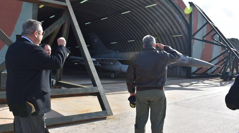 Αριστερά στη φωτογραφία φαίνεται ο υπουργός Άμυνας Πάνος Καμμένος να κάνει το σήμα του σταυρού προς τους πιλότους των μαχητικών αεροσκαφών επιφυλακής που απογειώνονται για να αναγνωρίσουν και να αναχαιτίσουν εικονικά τα τουρκικά αεροσκάφη ενώ ο αρχηγός ΓΕΑ αποδίδει τιμές στους ιπτάμενους της Πολεμικής Αεροπορίας.