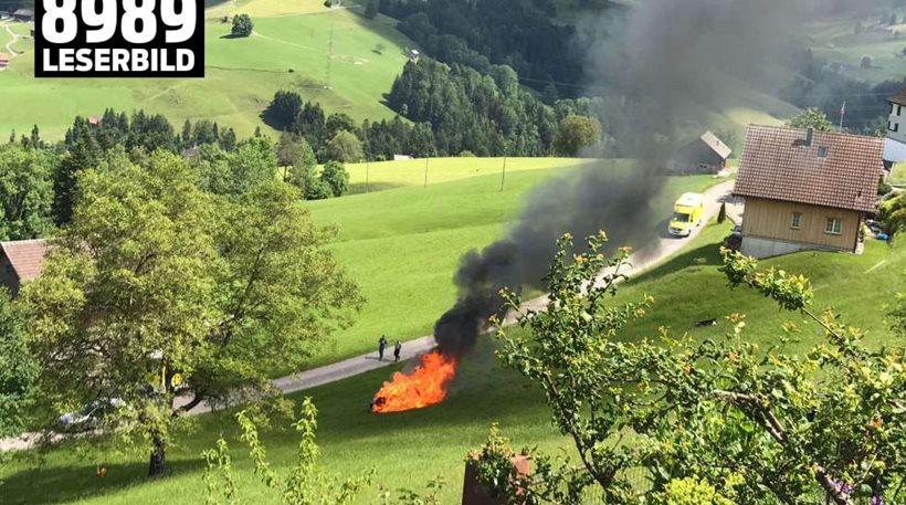 Φωτογραφίες που έχουν κυκλοφορήσει στο διαδίκτυο δείχνουν ένα όχημα παραδομένο στις φλόγες σε δρόμο της περιοχής St. Gallen.
