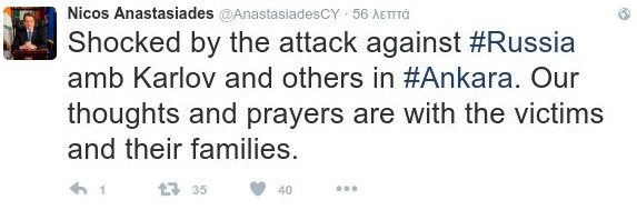 «Σοκαρισμένος από την επίθεση κατά του Ρώσου πρέσβη Καρλόβ και άλλων στην Άγκυρα. Οι σκέψεις και οι προσευχές μας είναι με τα θύματα και της οικογένειές τους», σημειώνει ο Νίκος Αναστασιάδης στο μήνυμά του.