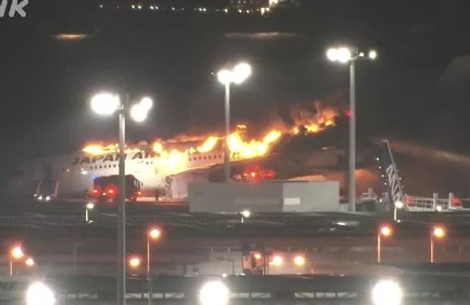 Aεροσκάφος της εταιρείας Japan Airlines φλέγεται στον διάδρομο προσγείωσης-απογείωσης του αεροδρομίου του Τόκιο, του Χανέντα, αφού φαίνεται πως συγκρούσθηκε με αεροσκάφος της Ακτοφυλακής, μετέδωσε το τηλεοπτικό δίκτυο Nippon TV, ενώ οι περίπου 400 επιβαίνοντες σε αυτό έχουν απομακρυνθεί.