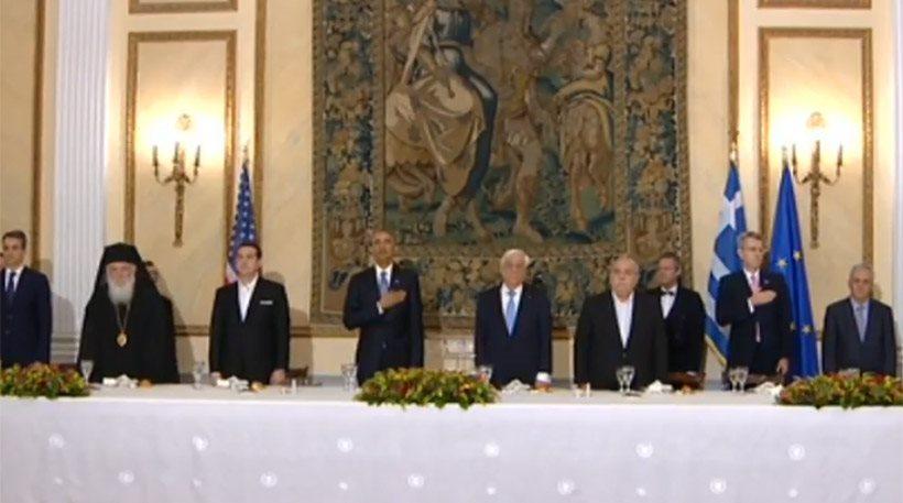 Δεξιά από τον Μπάρακ Ομπάμα κάθισαν οι κ.κ. Τσίπρας, Ιερώνυμος, Μητσοτάκης, Λιου και Τσακαλώτος, ενώ αριστερά του Προέδρου των ΗΠΑ οι κ.κ. Παυλόπουλος, Βούτσης, Πιάτ, Δραγασάκης και Καμμένος.