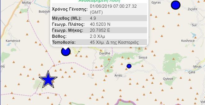 Η πρώτη σεισμική δόνηση 5 βαθμών της κλίμακας Ρίχτερ καταγράφηκε στις 7 και 26 πρώτα λεπτά και το επίκεντρο σύμφωνα με το Αστεροσκοπείο Αθηνών εντοπίζεται 47 χιλιόμετερα δυτικά της Καστοριάς στο έδαφος της Αλβανίας.