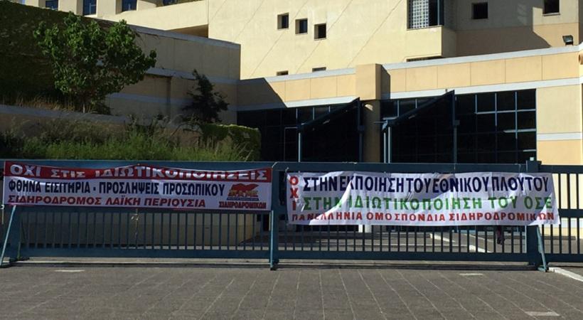 Με κρεμασμένα τα πανό τους πάνω στα κάγκελα του υπουργείου Μεταφορών οι διαδηλωτές ζητούν από την κυβέρνηση να μην προχωρήσει σε καμία εκποίηση του «Εθνικού πλούτου ανάμεσά τους και οι σιδηρόδρομοι».