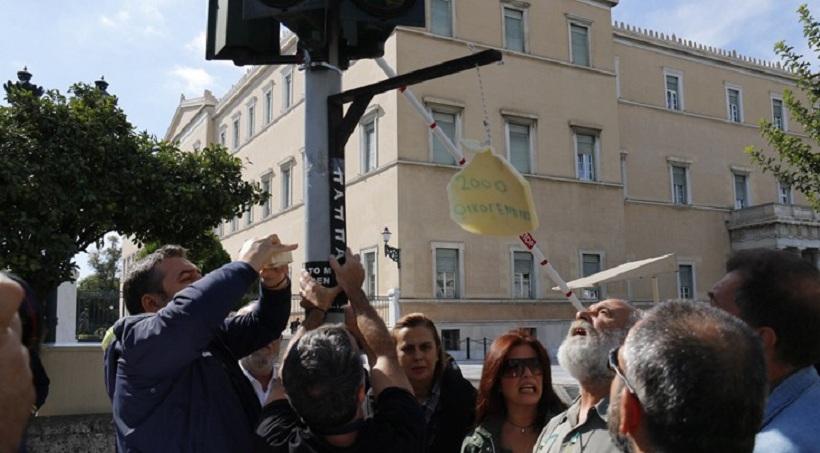 Οι εργαζόμενοι στα κανάλια έχουν στήσει μία κρεμάλα στην οποία γράφουν «2.000 οικογένειες» ενώ έχουν κρεμάσει πανό που γράφει «κάτω τα ξερά σας από τις οικογένειές μας».