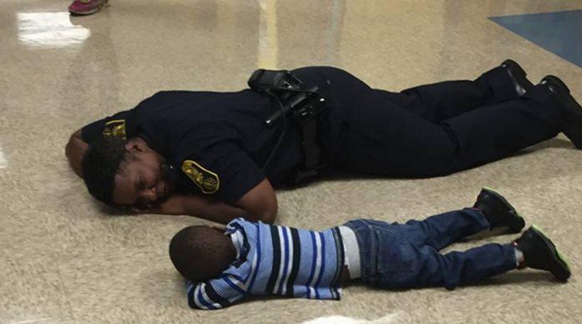 ον γύρο των αμερικανικών ΜΜΕ κάνει τις τελευταίες ώρες μια συγκινητική φωτογραφία, η οποία απεικονίζει έναν αστυνομικό από την πολιτεία της Ιντιάνα να είναι πεσμένος μπρούμυτα δίπλα από ένα αγοράκι και να του μιλά τρυφερά.