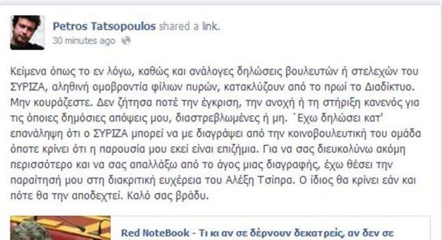 Την παραίτησή του στη διακριτική ευχέρεια του προέδρου του ΣΥΡΙΖΑ, Αλέξη Τσίπρα, έθεσε, όπως ανακοίνωσε μέσω Facebook, ο βουλευτής του κόμματος, κ. Πέτρος Τατσόπουλος, ενώ στη συνέχεια το επιβεβαίωσε και σε τηλεοπτικές του δηλώσεις. Την απόφαση για το αν ο Πέτρος Τατσόπουλος θα λάβει διαζύγιο από τον ΣΥΡΙΖΑ θα λάβει ο Αλέξης Τσίπρας ο οποίος έχει καλέσει για εξηγήσεις τον βουλευτή. Η συνάντηση Τσίπρα-Τατσόπουλου θα γίνει την Παρασκευή.