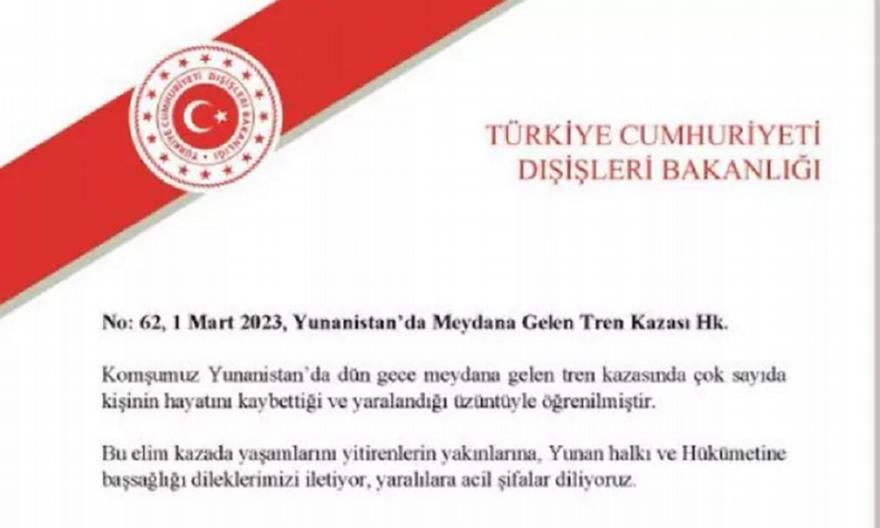 Ανακοίνωση για το πολύνεκρο δυστύχημα μετά από σύγκρουση τρένων στα Τέμπη εξέδωσε το τουρκικό υπουργείο εξωτερικών, εκφράζοντας «συλλυπητήρια» στους συγγενείς των νεκρών, στον ελληνικό λαό και στην κυβέρνηση.
