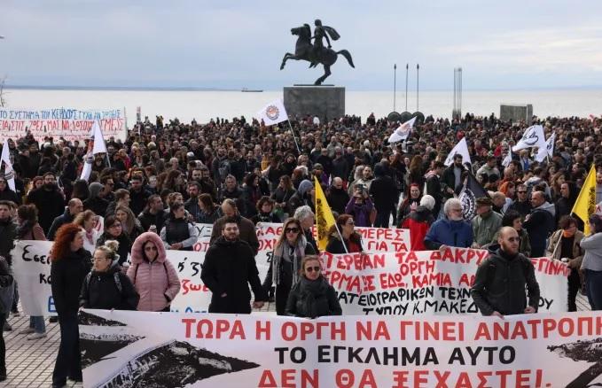 Συγκέντρωση διαμαρτυρίας στο άγαλμα του Βενιζέλου και πορεία σε κεντρικούς δρόμους της Θεσσαλονίκης πραγματοποίησαν σήμερα μέλη σωματείων, φοιτητές, μέλη συλλόγων, οργανώσεις γυναικών, μέλη της εξωκοινοβουλευτικής Αριστεράς και πολίτες με αφορμή το τραγικό πολύνεκρο δυστύχημα στα Τέμπη.
