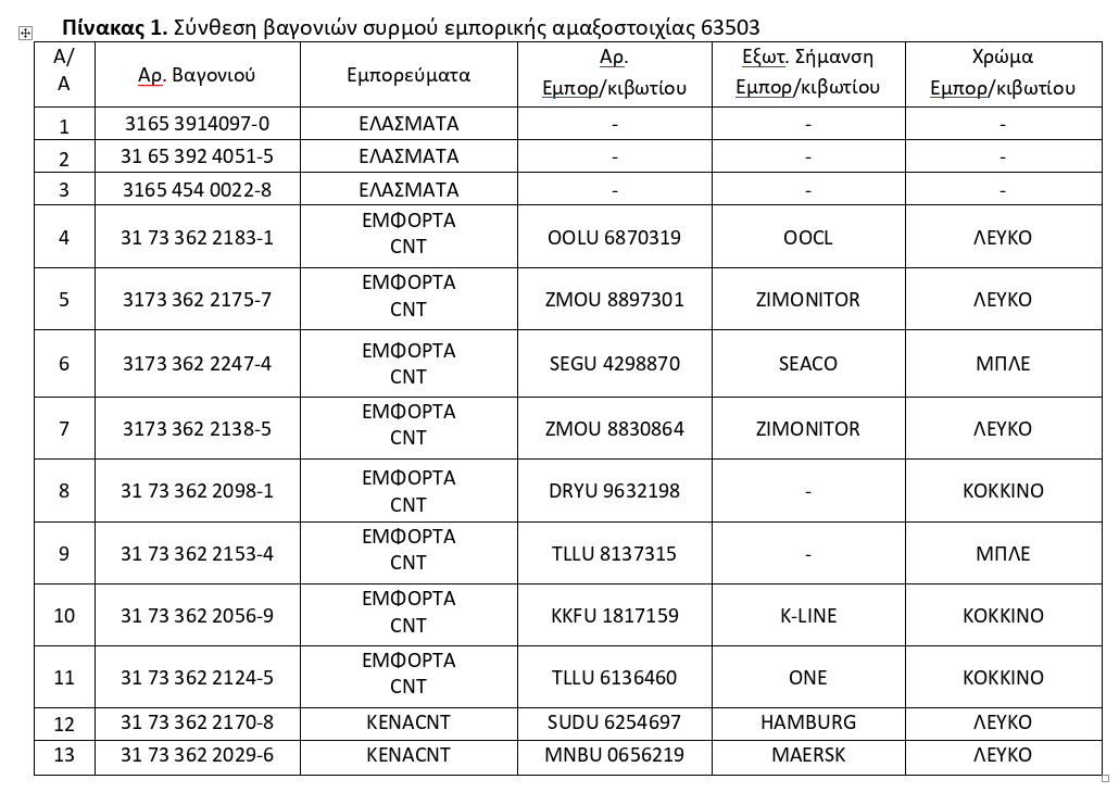 «Η εμπορική αμαξοστοιχία αποτελούνταν από δύο (2) εν σειρά ηλεκτράμαξες σε ζεύξη διπλής έλξης (κατά σειρά Η/Α 1 120-022 και Η/Α 2 120-012) και δεκατρείς (13) φορτάμαξες (πλατφόρμες) με σύνθεση όπως περιγράφονται στον παρακάτω Πίνακα 1, με στοιχεία χορηγηθέντα από την Hellenic Train», σημειώνουν.