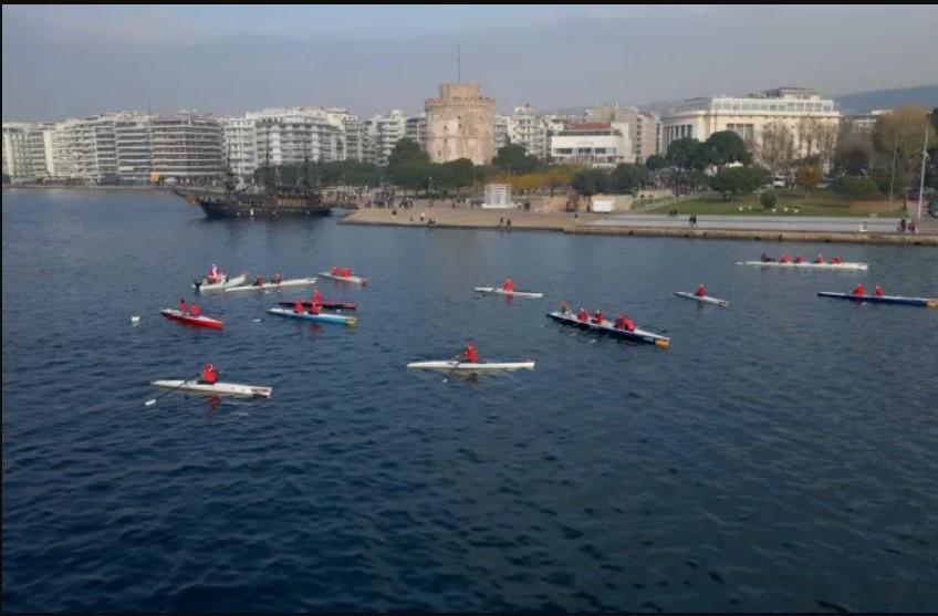 Ο λόγος για περίπου 80 μέλη του τμήματος παράκτιας κωπηλασίας ενηλίκων του Ομίλου Φίλων Θαλάσσης, που φόρεσαν γιορτινά ρούχα και μπήκαν στο νερό για να διασκεδάσουν οι ίδιοι, αλλά και να υπενθυμίσουν σε όσους βρισκόταν κατά μήκος της Νέας και της Παλιάς Παραλίας της Θεσσαλονίκης, ότι πλησιάζουν τα Χριστούγεννα.